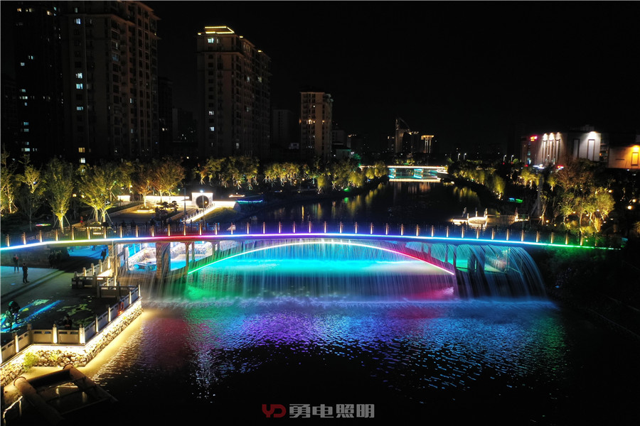 大橋兩側(cè)噴泉瀑布隨著五顏六色光的變化