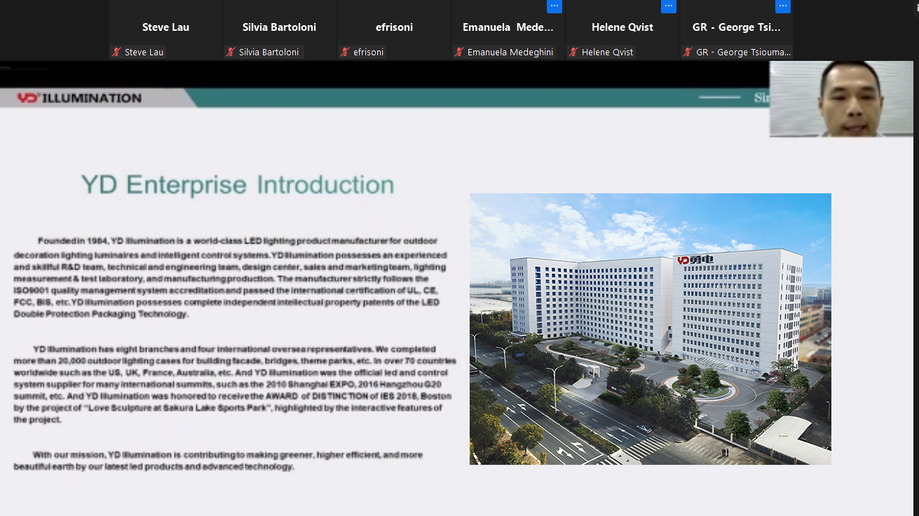 勇電國際貿易總監徐海晟和智能照明研究院副院長劉騰海Steve Lau受邀出席會議,并以線上云分享的方式發表了技術演講,與來自意大利、俄羅斯、法國、英國、荷蘭等國家眾多照明大師共探智慧城市照明及戶外建筑照明等重點論題。