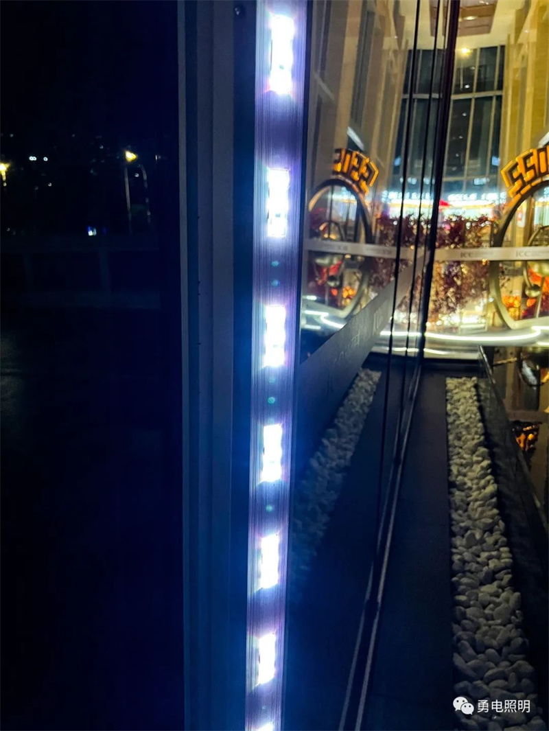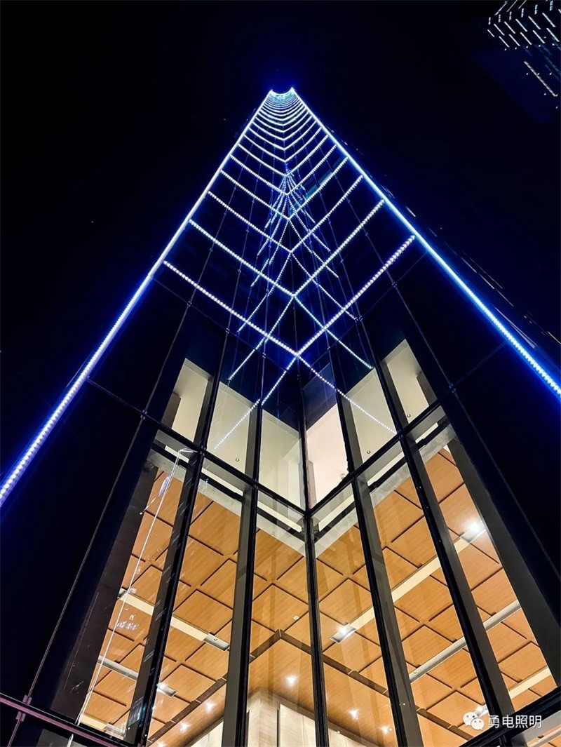 建筑立面四個角邊內(nèi)部變化復(fù)雜,幾乎每層安裝燈具的拐角直徑都不一致,加上全幕墻肌理,裝燈難度大。經(jīng)多次試燈,最終選用勇電二次封裝16*60 LED方形光源,沿幕墻鋼架采用鋁槽安裝固定,勾勒建筑拐角的橫、豎輪廓,將不規(guī)則立面用燈光連接起來。